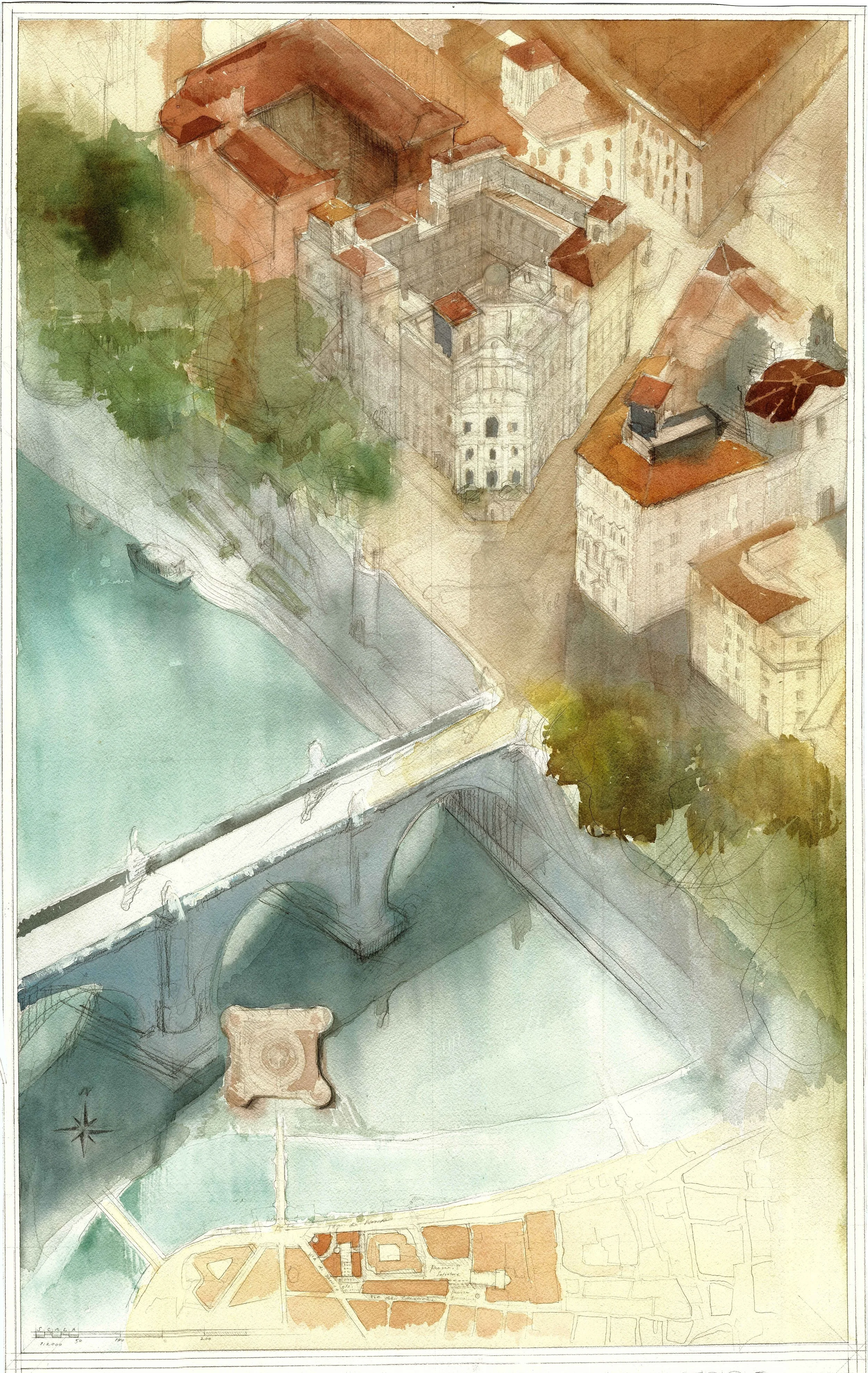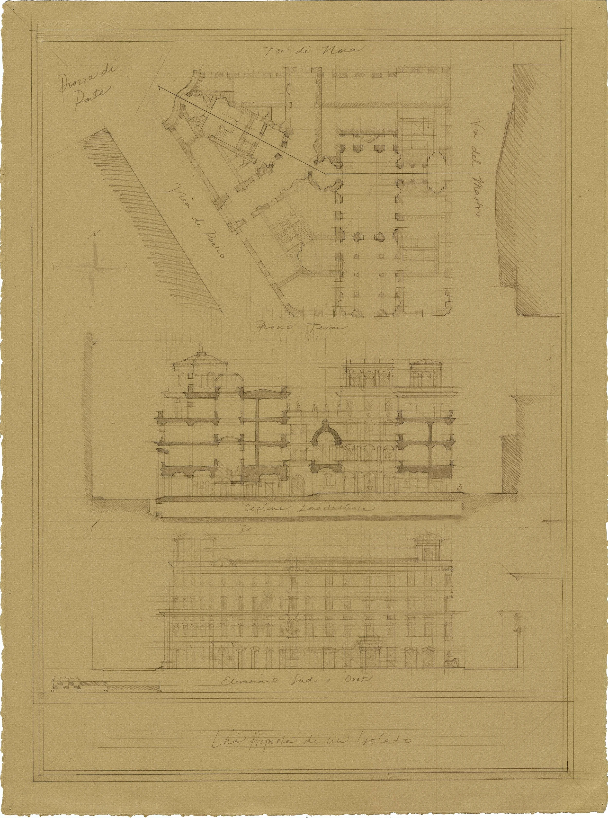 Located in Ponte Rione V, the proposed isolato takes advantage of its position provided by the Renaissance trident off Piazza di Ponte Sant’Angelo by meeting a chamfered and monumental facade, an ode to the Ponte’s Baroque past. It will provide a space for artists to engage with the local community in the Accademia Raffaello as well as offering a range of low to high income apartments, all of which are mixed use to further engage the urban stroll experience.